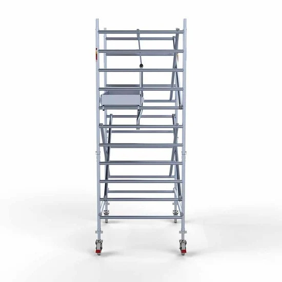 Este andamio consta de los siguientes componentes: - 2x Marco 2 m, 135 cm, 7 peldaños - 2x Marco 1 m, 135 cm, 4 peldaños - 1x Plataforma con trampilla 190 cm - 1x Barandilla plegable de 190 cm - 6x Barra diagonal 190 cm - 2x Barra horizontal 190 cm - 1x Conjunto de rodapiés de aluminio 75x190 cm - 4x Rueda de nailon 200 mm + eje de acero - 4x Clips de seguridad
