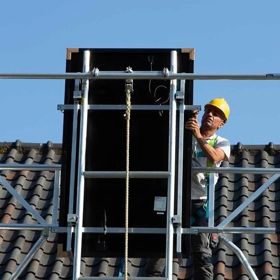 Aliuminio bokštas135x305, kurio darbinis aukštis 12,2 metro, turi saulėskeltuvą ir Safeguard stogo krašto apsaugą. „Euroscaffold“ , pirmaujantipastolių gamintoja, sukūrė saulės baterijų keltuvą, kad būtų galimalengvai ir saugiai pakelti saulės baterijas. Įstatykite saulės modulių įpastolių bokšto kėlimo sistemą ir kėlimo lynu pakelkite į norimą aukštį.Pakelti saulės baterijas dar niekada nebuvo taip paprasta. Nebereikianepatogaus sunkių saulės baterijų kėlimo ant aukščiausios pastoliųplatformos. Visiškai atitinka saugos taisykles ir sumažina nelaimingųatsitikimų riziką. Saulės keltuvas pagamintas iš aukštos kokybėsaliuminio Euroscaffold Olandijos gamykloje.